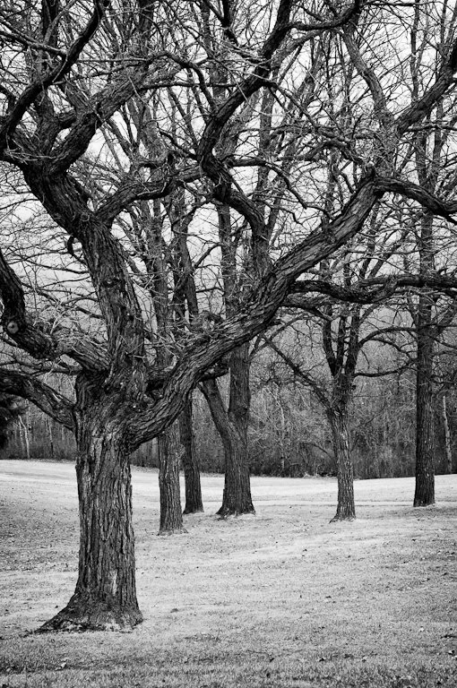 Was with a friend today scouting locations for pictures at his upcoming wedding. It’s still early spring and the golf course is pretty threadbare, which lends itself to some great textures and really gnarly, naked trees. Take this one for instance. Screaming for black and white…